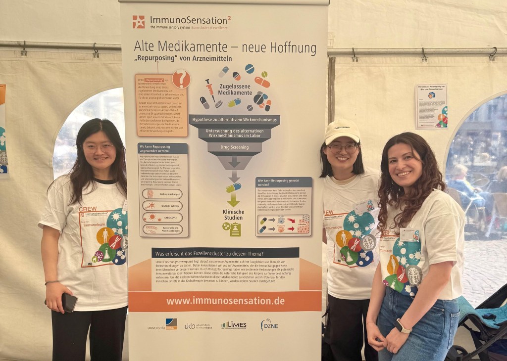 As part of the Day of Immunology event, our group members Wei, Hazel, and Yixuan presented their poster titled “Alte Medikamente – neue Hoffnung: ‘Repurposing’ von Arzneimitteln” (“Old Drugs – New Hope: Repurposing of Pharmaceuticals”). In addition to the poster presentation, Hazel also took part in a science pitch video, where she briefly explained the project’s goals and significance. The event provided a valuable opportunity to share our research with the public, engage in insightful conversations, and answer a variety of questions from attendees.